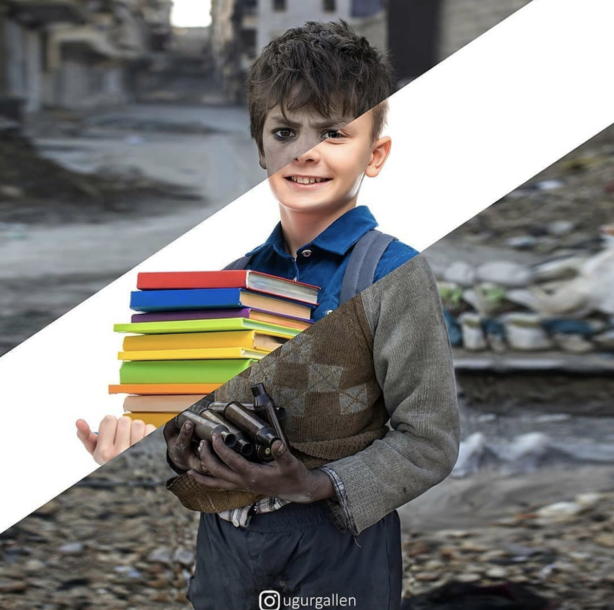 Uma criança que carrega livros; outra que carrega munição de metralhadoras. Uma criança que brinca de gangorra; outra que descansa sobre a boca de um canhão.