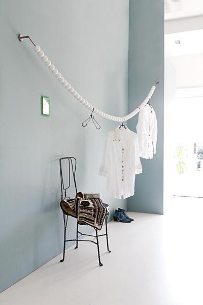 Quem foi que disse que você precisa de um guarda-roupas? Um varal simples e reto dá conta do recado. Uma versão mais ousada e perfeita para quem não tem um espaço muito grande para esticar o varal é essa ideia com bolinhas que seguram os cabides.