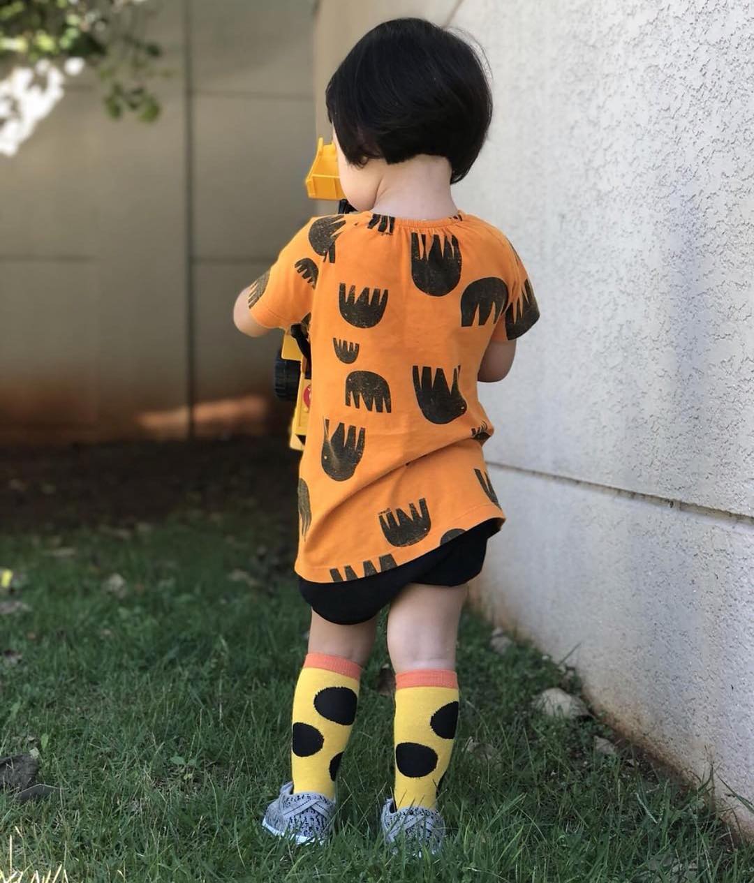 Imagine esse look sem a meia. Bem básico, né? Mas o modelinho Dona Girafa, da Cantarola, muda tudo com a aposta em um maxi-poá que acrescenta três cores à produção: amarelo, laranja e preto (os detalhes azuis ficam escondidos na maioria dos sapatos). Nesse lookinho, o laranja do detalhe da meia toma conta da camiseta, e o preto das bolinhas conversa tanto com o short quanto com a estampa do top. Fofura!